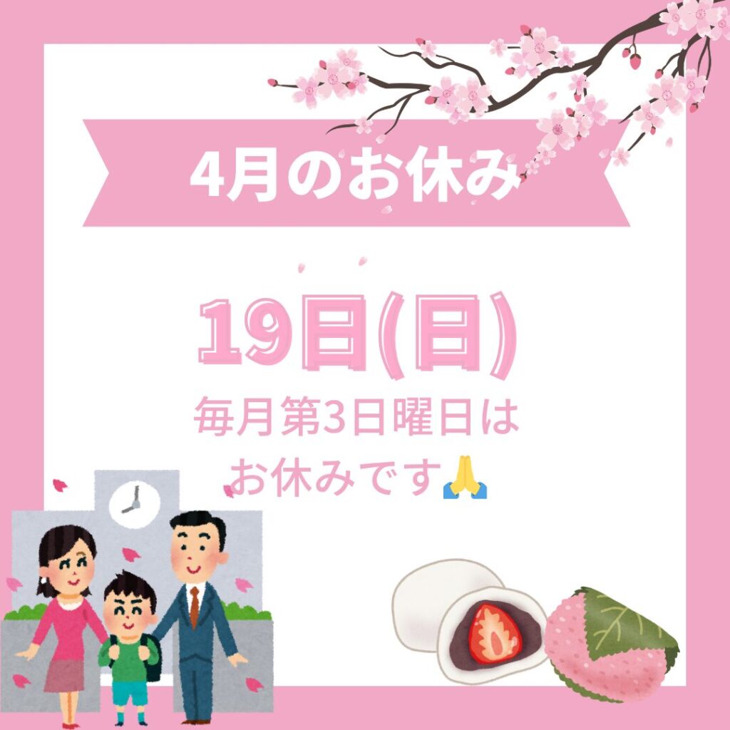 店舗情報 2026年04月12日 4月定休日のお知らせ いつもご利用いただきましてありがとうございます! ================================================ 4月の定休日は 《19日日曜日》です! ================================================ 【毎月第3日曜日】は定休日です!! 定休日以外は毎日営業しておりますので、皆さまのご来店をお待ち致しております✨ chevron_left 3月のチラシ情報